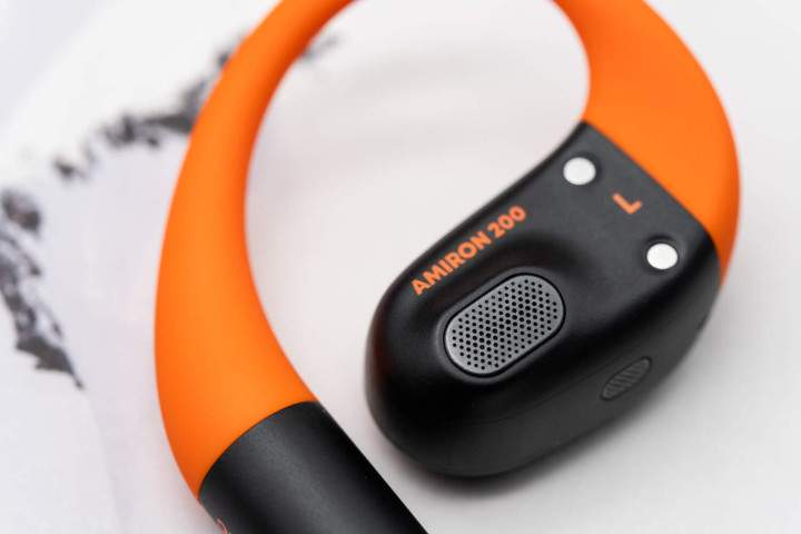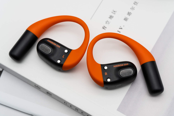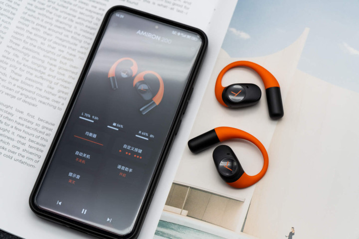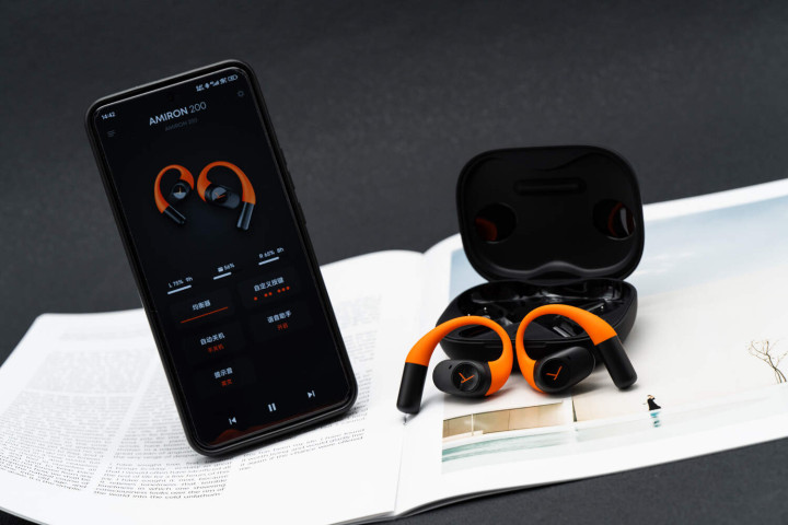 AMIRON200耳机本体是常见的螺旋式OWS耳挂结构,发声单元的网面正对耳道的位置,佩戴时只需逆时针(右侧,左侧为顺时针)轻轻转动至合适位置即可。耳机柄部为圆润的柱体,佩戴时位于耳后。AMIRON200的总体体积比VERIO200要小很多,也轻便很多,没有了后者耳挂转轴与单元之间的夹角,长时间佩戴的舒适度要优秀很多,笔者实测佩戴一下午都毫无感觉,基本上可以当作全程“通透模式”的TWS来使用。AMIRON200有三个配色,分别是“经典黑”、“月银白”和“芬达橙”,分别对应不同的用户群体喜好,从商务风、小清新到混色的炫酷感都能满足。